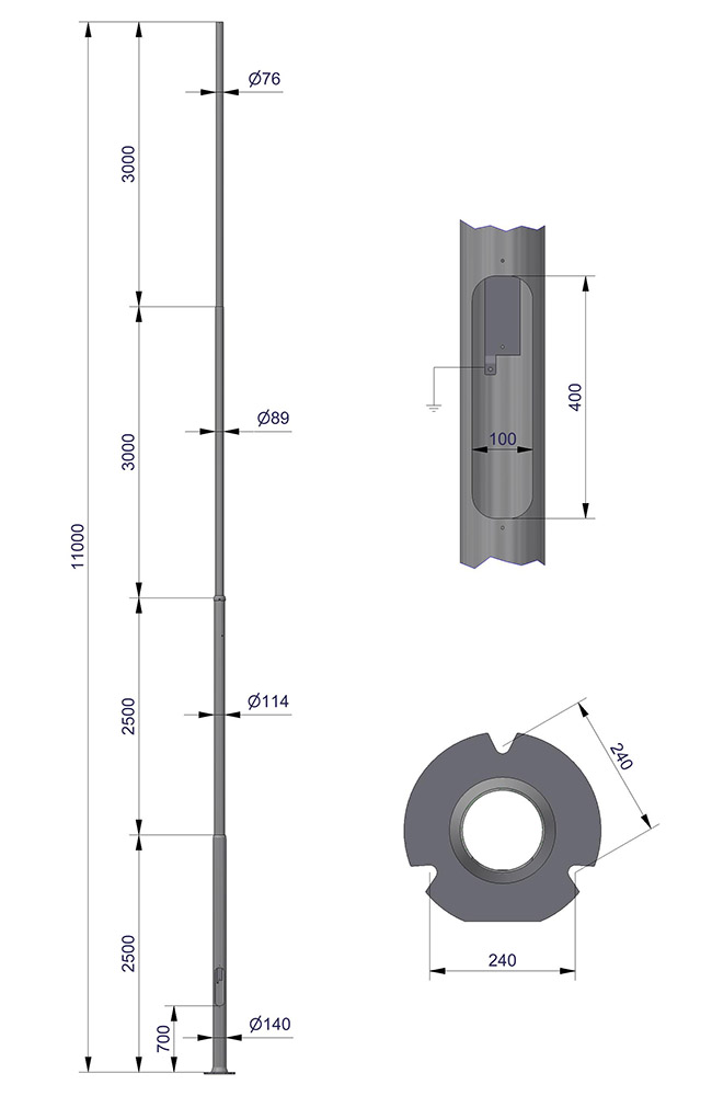 Mastene er bygget opp med avtrappede rørdimensjoner, fotplate for RO-ledd og leveres todelt. Mastene er borret i topp for Euroskjøt. Tilhørende gjengestifter til montering finnes innvendig i mast bak koblingsluke, disse leveres i syrefast (A4) kvalitet. Avstand fra fotplate til lukeåpning = 700mm.