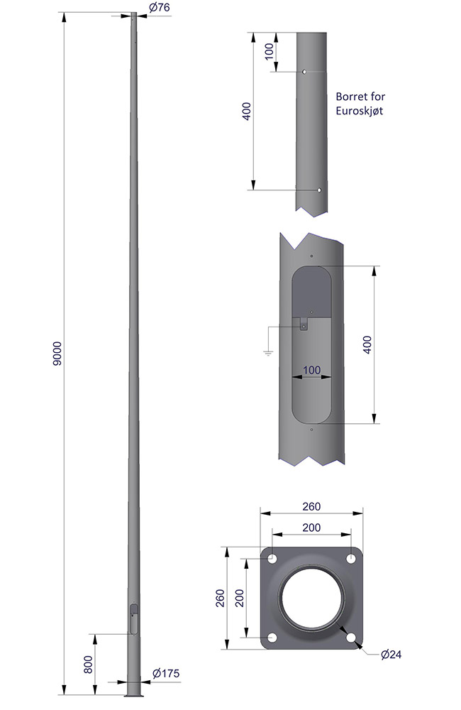 Mastene er produsert av koniske runde rør uten synlig sveisesøm. Avstand fra fotplate til lukeåpning = 800 mm.
