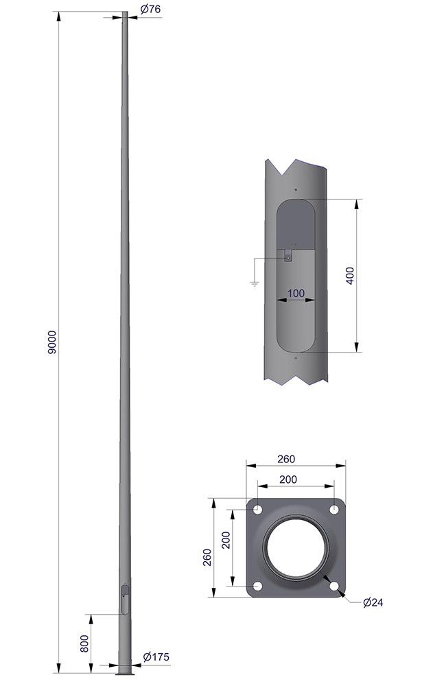 Mastene er produsert av koniske runde rør uten synlig sveisesøm. Avstand fra fotplate til lukeåpning = 800 mm.