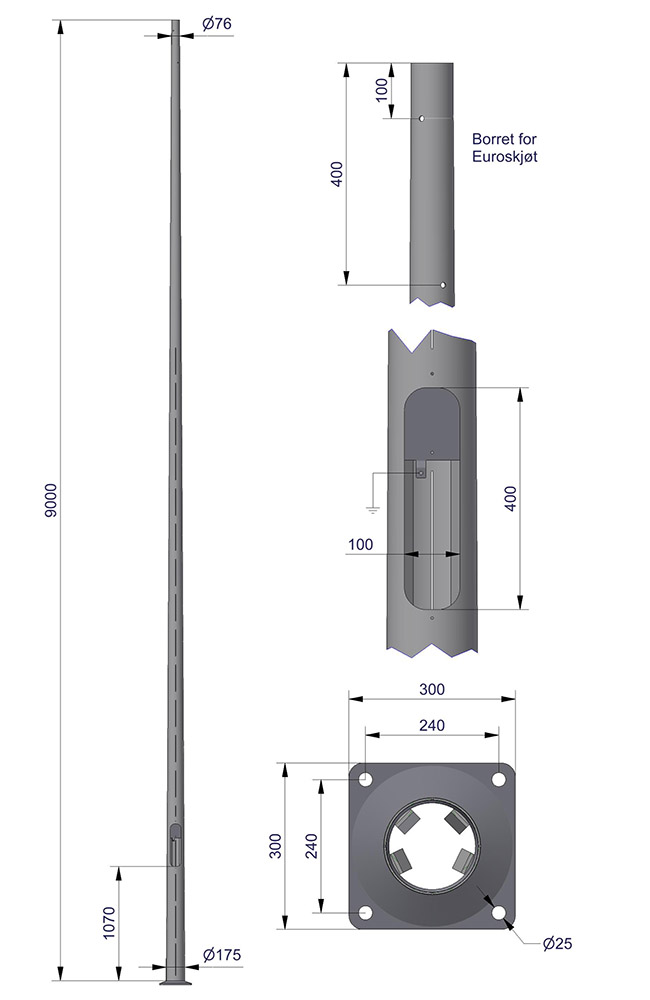Mastene er produsert av koniske runde rør uten synlig sveisesøm med fotplate c/c 240 mm. Mastene er borret i topp for Euroskjøt. Avstand fra fotplate til lukeåpning = 1070 mm.