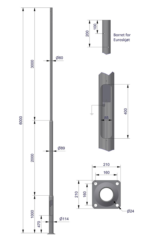 Mastene er bygget opp med avtrappede rørdimensjoner. Avstand fra fotplate til lukeåpning = 470 mm.