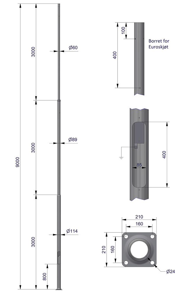 Mastene er bygget opp med avtrappede rørdimensjoner. Avstand fra fotplate til lukeåpning = 800 mm.