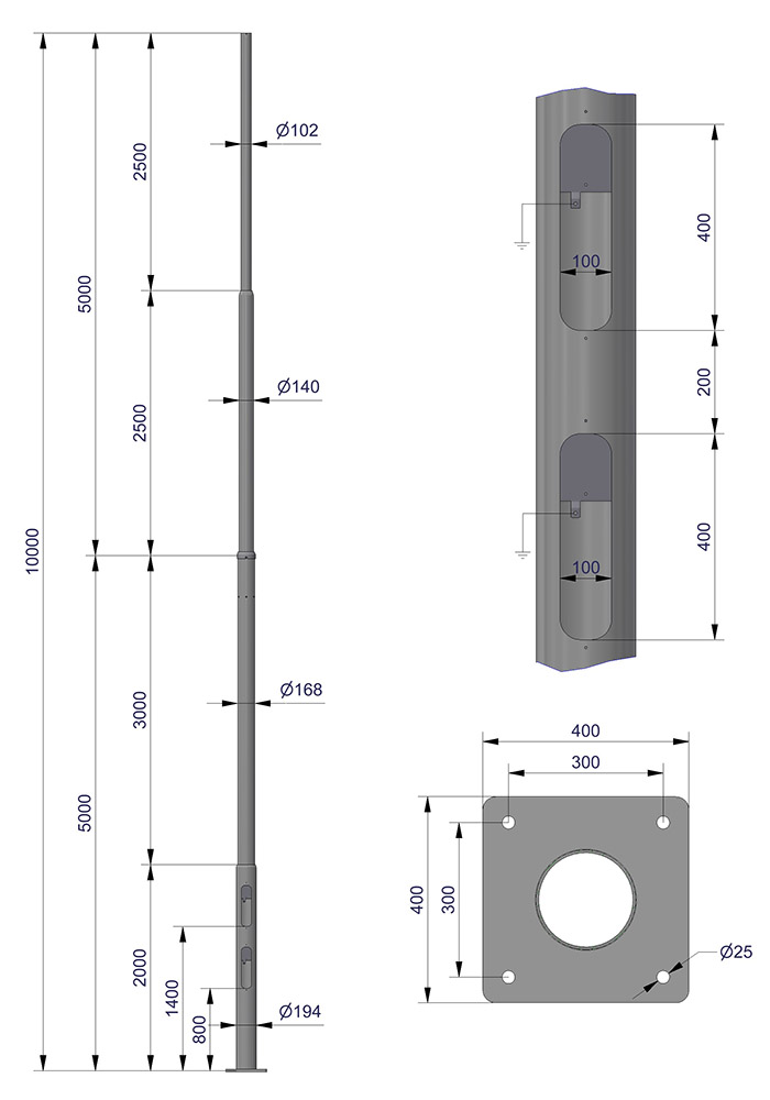 Mastene er bygget opp med avtrappede rørdimensjoner. Avstand fra fotplate til lukeåpning = 800mm.