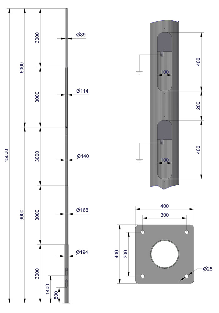 Mastene er bygget opp med avtrappede rørdimensjoner. Avstand fra fotplate til lukeåpning = 800mm.