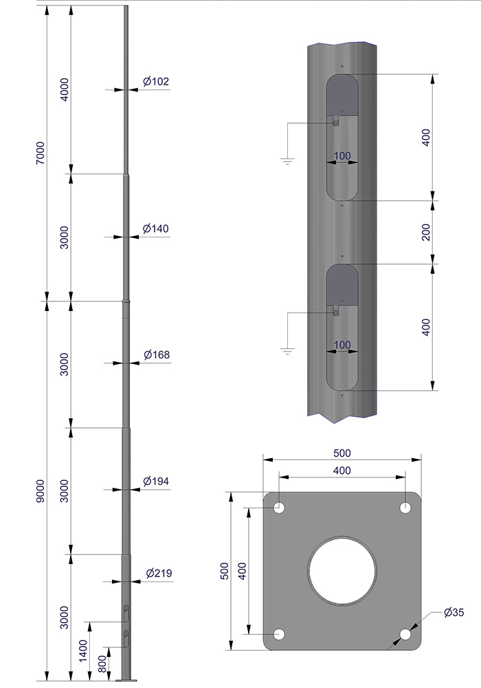 Mastene er bygget opp med avtrappede rørdimensjoner. Avstand fra fotplate til lukeåpning = 800mm.