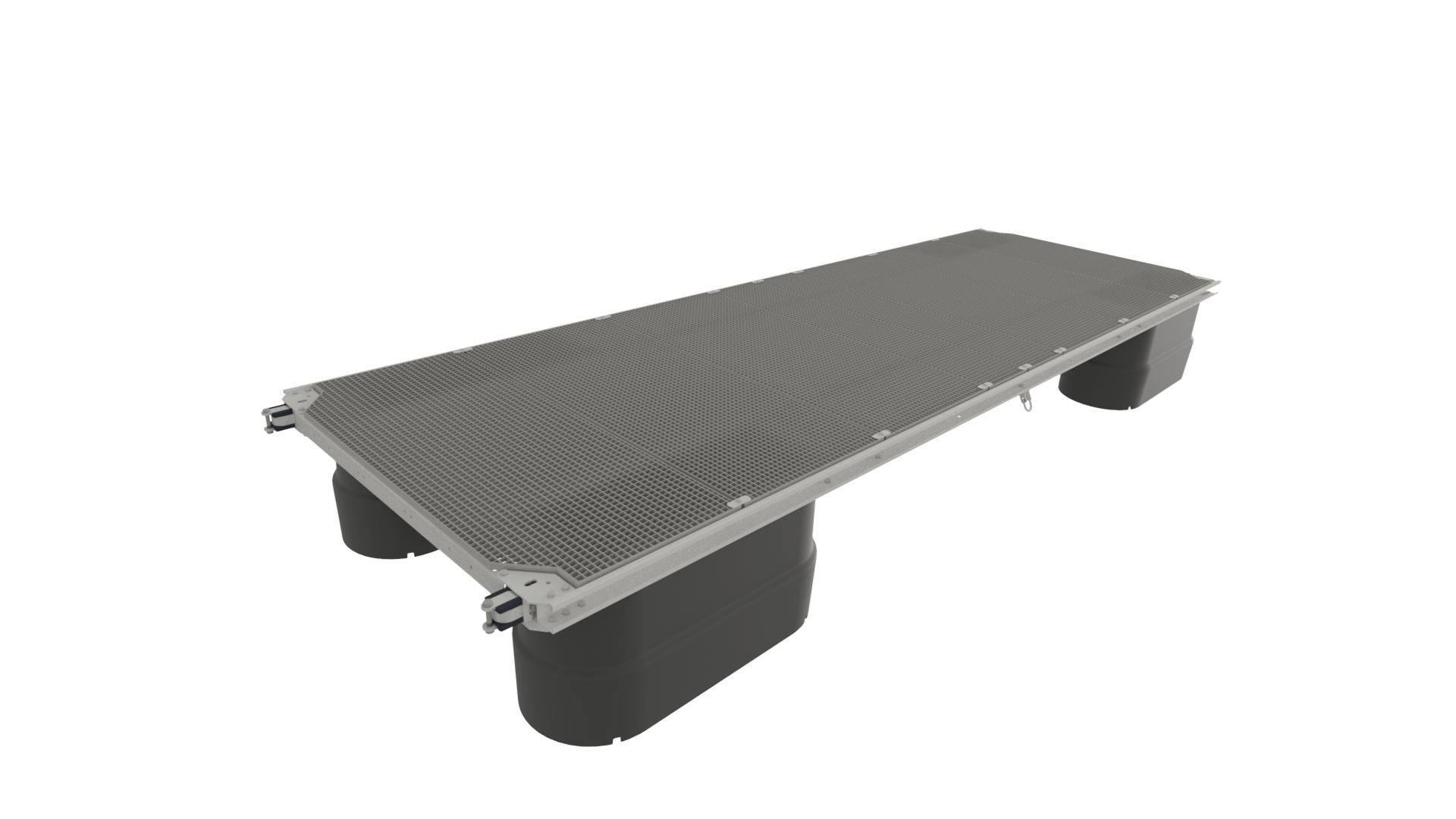 Stålbryggen leveres som standard med 4 stk. 630 liters pontonger, beregnet for utriggere på begge sider. Bryggen kan også leveres med 420 liters pontonger som gir 22 cm lavere fribord, noe som vil være bedre egnet om det er utriggere kun på en side eller uten utriggere. Vi anbefaler uansett at det tas kontakt med selger for beregning av beste konfigurasjon. Pontongene er av helstøpt polyetylen og er fylt med polystyren. Pontongene er synkefrie.